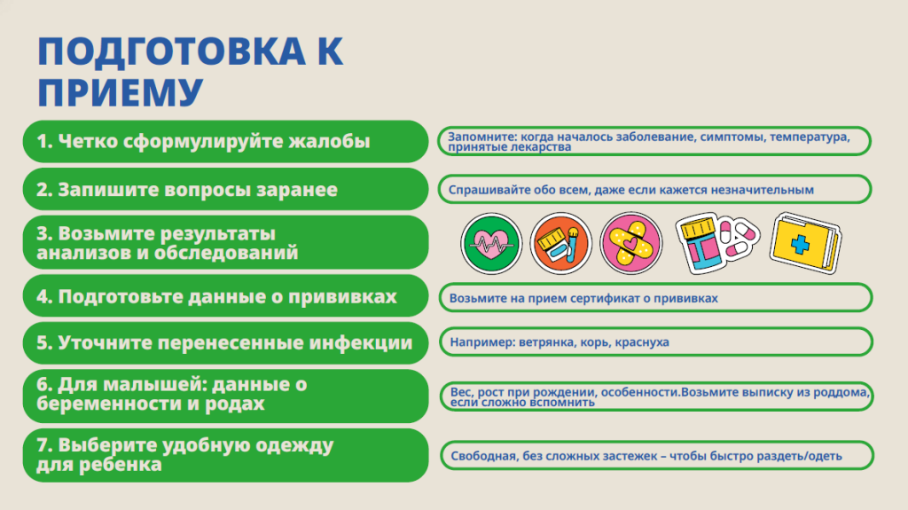 В инфографике рекомендации родителям ДО приёма, ВО время приёма и ПОСЛЕ приёма, способствующие повышению эффективности медицинского обслуживания и ускорению выздоровления ребёнка.