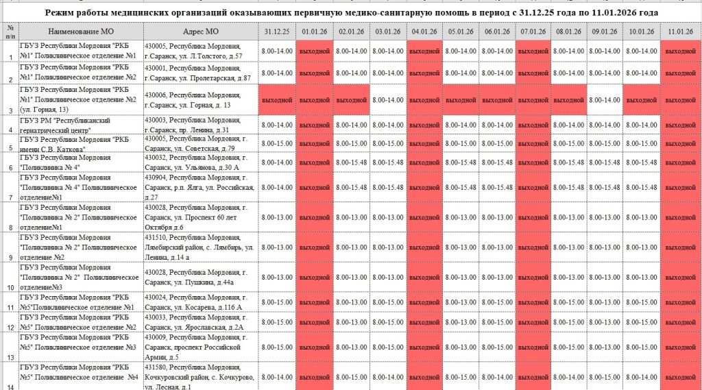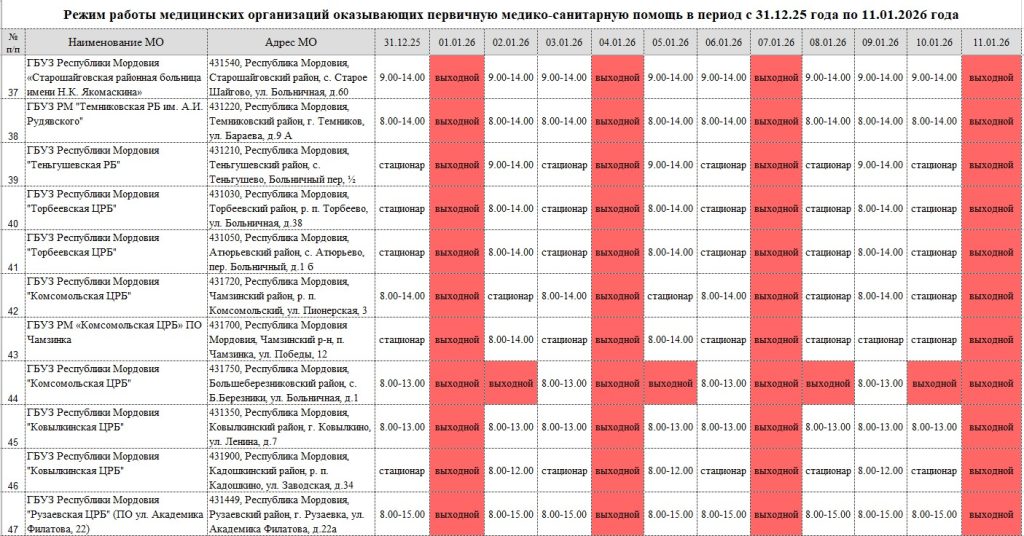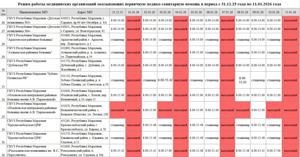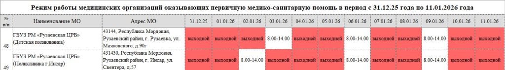 Режим работы медицинских организаций в праздничные дни с 31.12.25 по 11.01.26